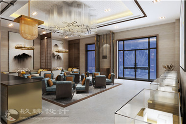 銷售中心的作用,歷來是要展現項目實力,渲染生活方式,多以至奢至大至精的要求打造。本案售樓中心從家具擺放到室內裝飾,無一不在強調精英人群的精致生活。拉絲吊燈,鑲嵌閃鉆如星光閃耀,以優雅的調性提升質感。洽談區天藍色天鵝絨布面包裹著的沙發椅舒適雅致,與售樓部整體相得益彰,周圍墻壁上的水墨山水圖恰如其分的表明了此處樓盤暗含的世外桃源意境,沙盤獨立分隔展示,給客戶以貴賓的服務于享受。室內以干枝枯木造景,配以鳥鳴,好一個山水田園生活!