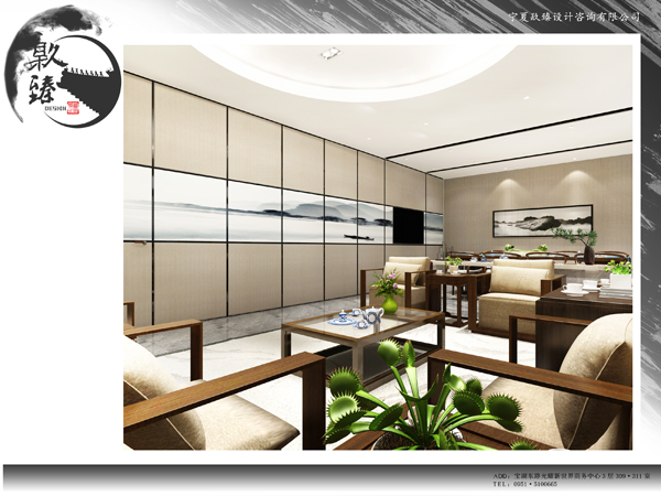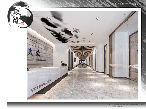 在前臺的房頂,裝飾上水墨畫——荷花,讓整個辦公樓更顯的禪意十足,不僅大廳如此。在會客廳,設計師也用荷花池來搭配,給人一種返璞歸真的感覺。