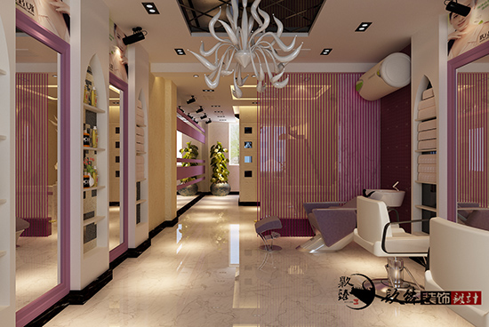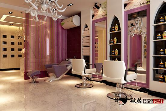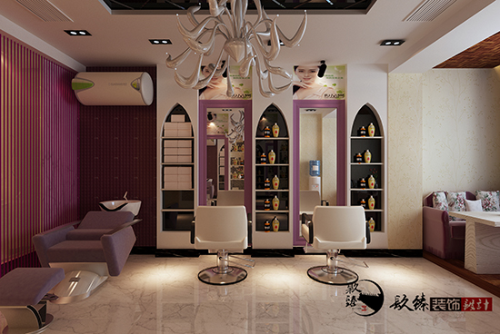顧客比較喜歡靚麗,溫暖,青春的顏色,最后使用了香芋紫色作為案例設計中的主打色調。鏡子是美發店中不可缺少的,怎樣可以把每一面鏡子合理的所連接到一起?是需要 設計師專業手法來進行搭配的。