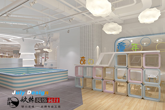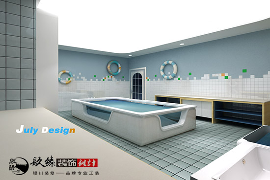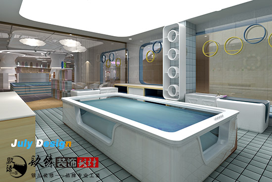 在本套方案中,分為了產品展示區,娛樂區,收銀區,還有一個大的區域,就是銀川母嬰店裝修設計|銀川裝修網嬰兒游泳區,這里用玻璃作為隔斷,很清楚的讓外面等候的家長們看到了里面寶寶游泳的場景,滿是溫馨的畫面。