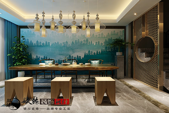 銀川裝修設計镹臻裝飾中的新中式別墅一共有三層,第一層除了客廳旁設計了茶室一間,對于成功人士來說中國的茶文化是不可缺的一部分,在品茶過程中體會人生中的苦樂酸甜,是對生活的一種向往。木質古典風格的桌椅身后是一幅布滿畫布的迎客松,要知道茶文化和迎客松都是中式文化中的精髓,所體現出的藝術形式正好符合該別墅的整體風格,樓梯處以鏤空造型的隔墻將兩個空間用專業的手法完美銜接。