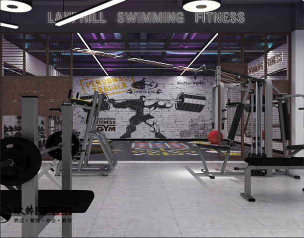 以黑色、黃色為主色調(diào),利用鐵藝打造工業(yè)風(fēng)格,本設(shè)計的一大亮點(diǎn)就是前臺側(cè)面的啞鈴雕塑。前臺、雕塑、接待區(qū)均采用鐵板制成。鐵藝的運(yùn)用打造濃濃工業(yè)風(fēng)。