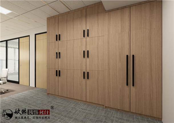 摒棄了一切繁文縟節的矯飾,一切盡在實用、明快而流暢的格局中;配合現代辦公環境的追求,設置實用與展示性相結合的半高書柜,旁倚商務型辦公桌,既陳設精雅、品味清亮、格調一致,又可于繁忙后賞窗外 風光、待客會友;直接在原頂噴涂乳膠漆,凸顯了現代辦公的簡潔,利用不同的燈具劃分了辦公、會客區的燈光。