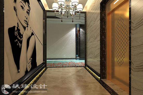 在大廳的設計上面,天花板的灰鏡上面呈現出與眾不同的造型燈,造型燈以耀眼的金黃色設計,更能彰顯整座大廳的高端、大氣的感覺,為整室形成一道亮麗的風景線,柔暖而簡約圖案的地板磚,中間相間的文理圖案跟天花板灰鏡中陳列的文案相互一致、相互協調,更能彰顯設計師在這塊的獨有天分和時尚質感,大廳的門以完全透明的玻璃設計,讓整個空間格局彰顯輕松明朗的感覺。