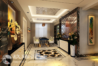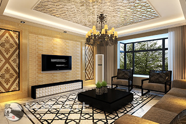 在客廳的設(shè)計中,主要運(yùn)用大理石地磚、壁紙以及石材掛畫,再配合簡潔舒適的咖啡色布藝沙發(fā),組合搭配了獨(dú)特而又時尚的風(fēng)格,并且與黑色的時尚茶幾再配合中國風(fēng)刻花電視背景墻,讓藝術(shù)與中國風(fēng)相互結(jié)合的恰到好處且十分凸顯個性,并且在奇特造型的吊燈和魚鱗狀的造型天花上,以其色彩亮麗的色調(diào)設(shè)計,使得整個客廳看起來時尚前衛(wèi),充滿大氣!