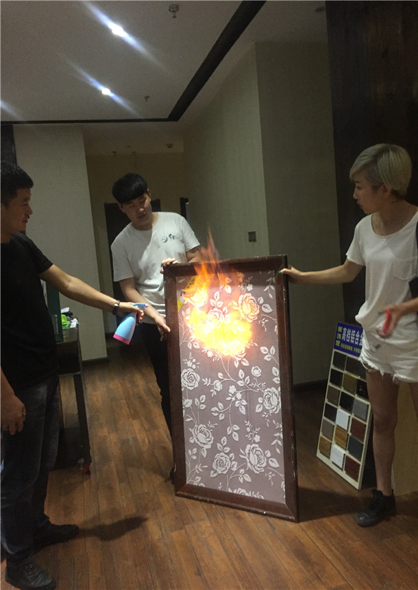 接下來高能!防火耐高溫演示:噴灑酒精后點火,樣品表面燃燒兩分鐘,滅火后無任何變化!